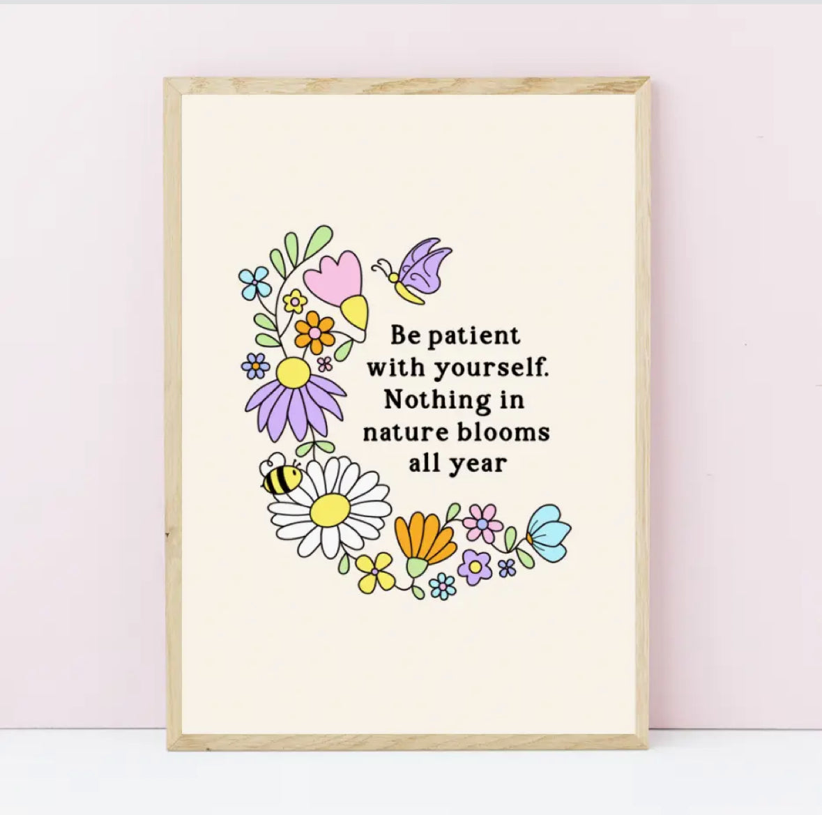 The central message, "Be patient with yourself. Nothing in nature blooms all year," is encircled by a delicate dance of...