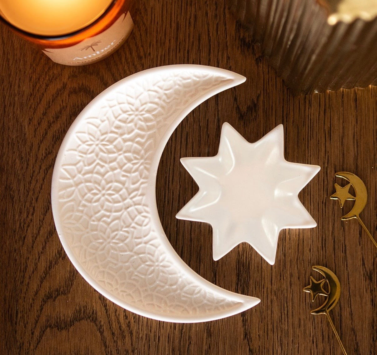This elegant set of ceramic trinket dishes includes one crescent moon and one star design, ideal for holding jewellery, small...