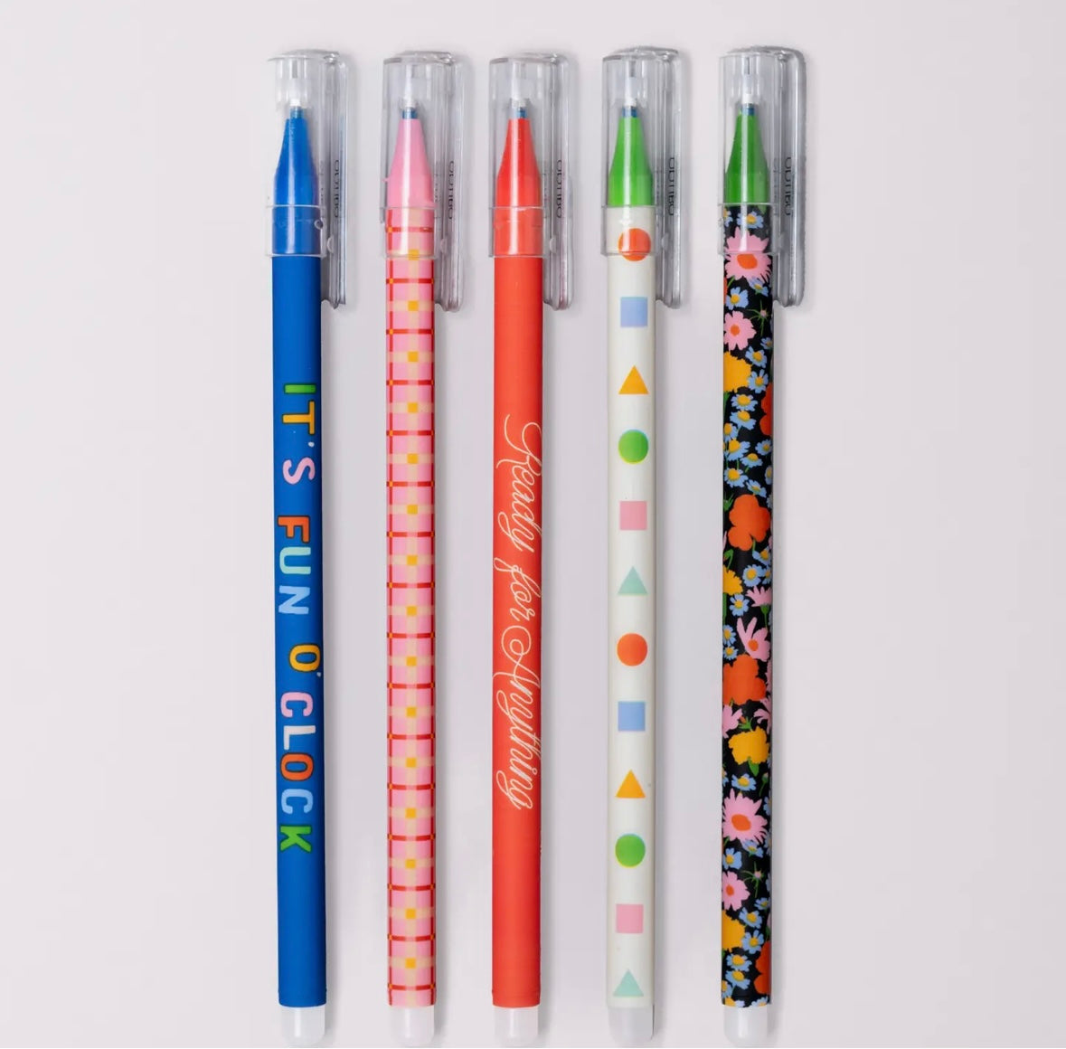 Erasable pens = the best of both worlds. This set features black ink, caps with clips, and five unique designs