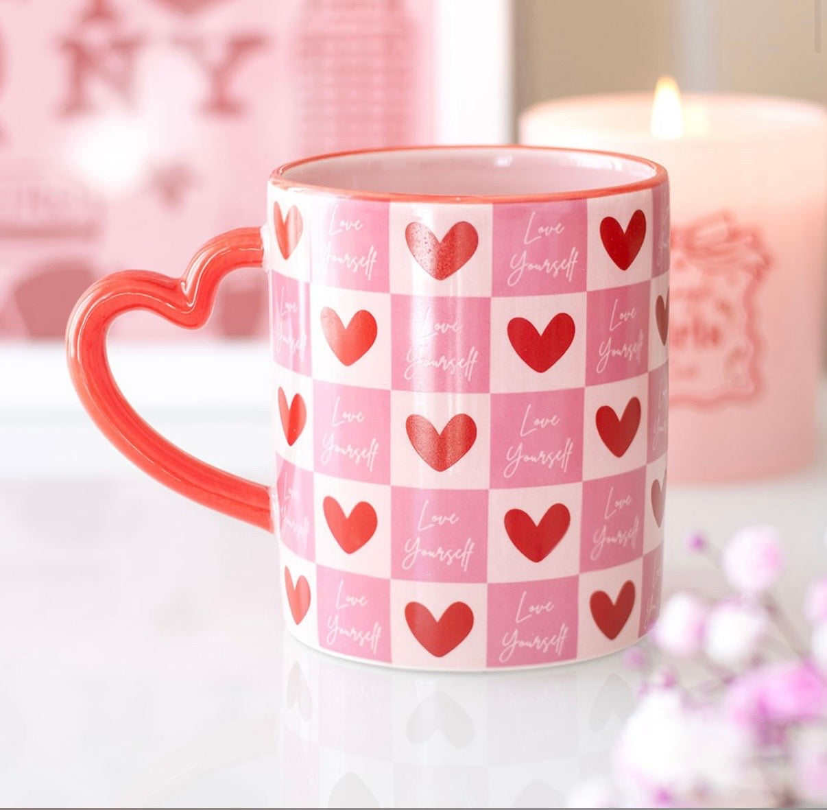 Start your morning with a little love using this checkered mug featuring 'Love Yourself' messages and a heart-shaped handle. A...