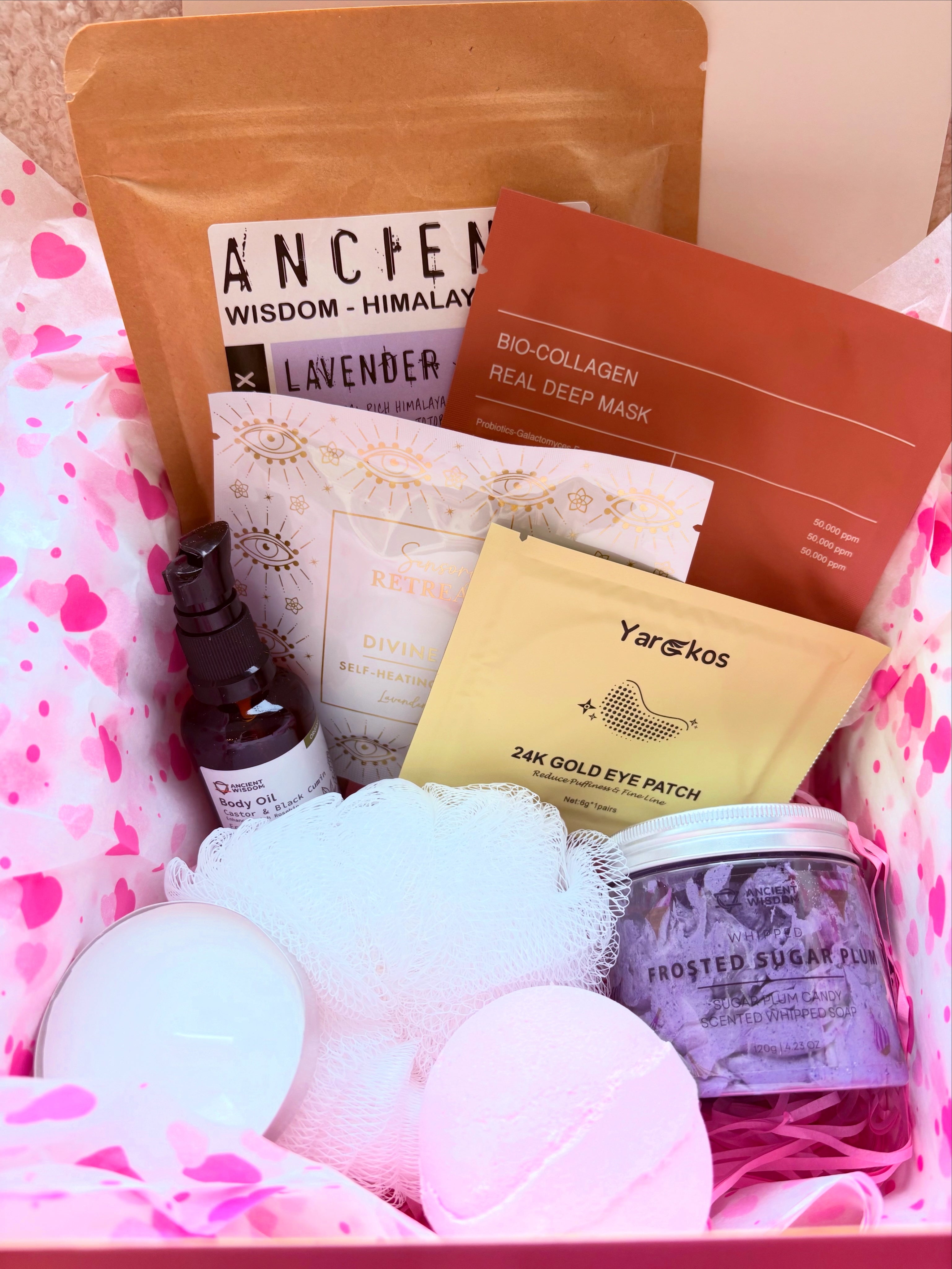 the ultimate self-care experience beautifully presented in a gift box tied with ribbon and lined with pink heart paper