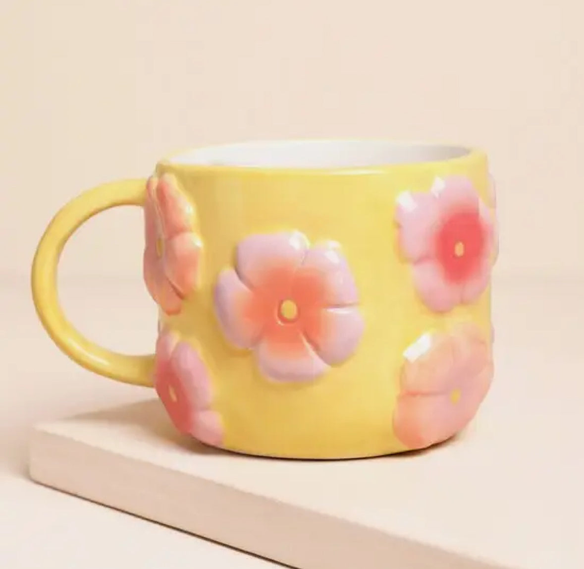 A glazed ceramic mug in light yellow with pink accents Featuring a 3D embossed floral design A colourful homeware present...