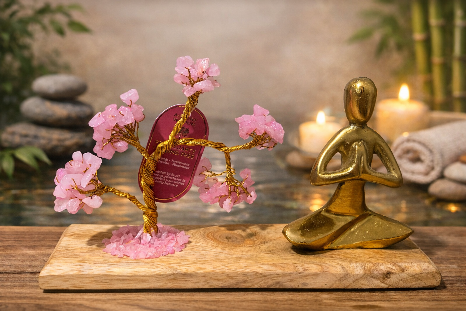 Feel the calming presence of the golden yoga figure, frozen in eternal namaste, reminding you to honour the divine light within. Watch as the delicate pink blossoms of the wire tree catch the morning light, creating a moment of beauty that grounds you before the day begins.