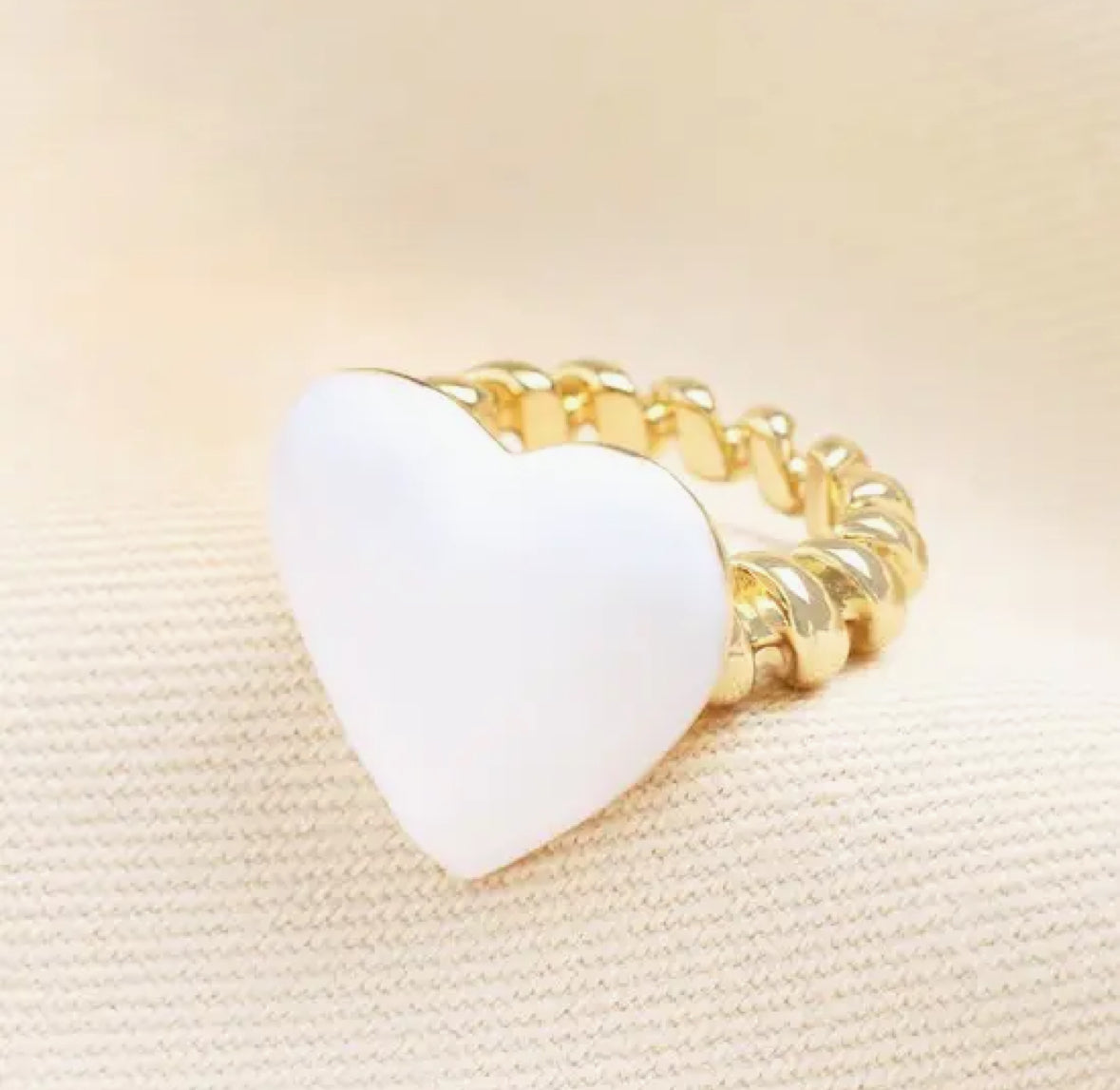 Oversized bold white enamel heart ring in gold for a striking look With a textured wavy band that adds a...