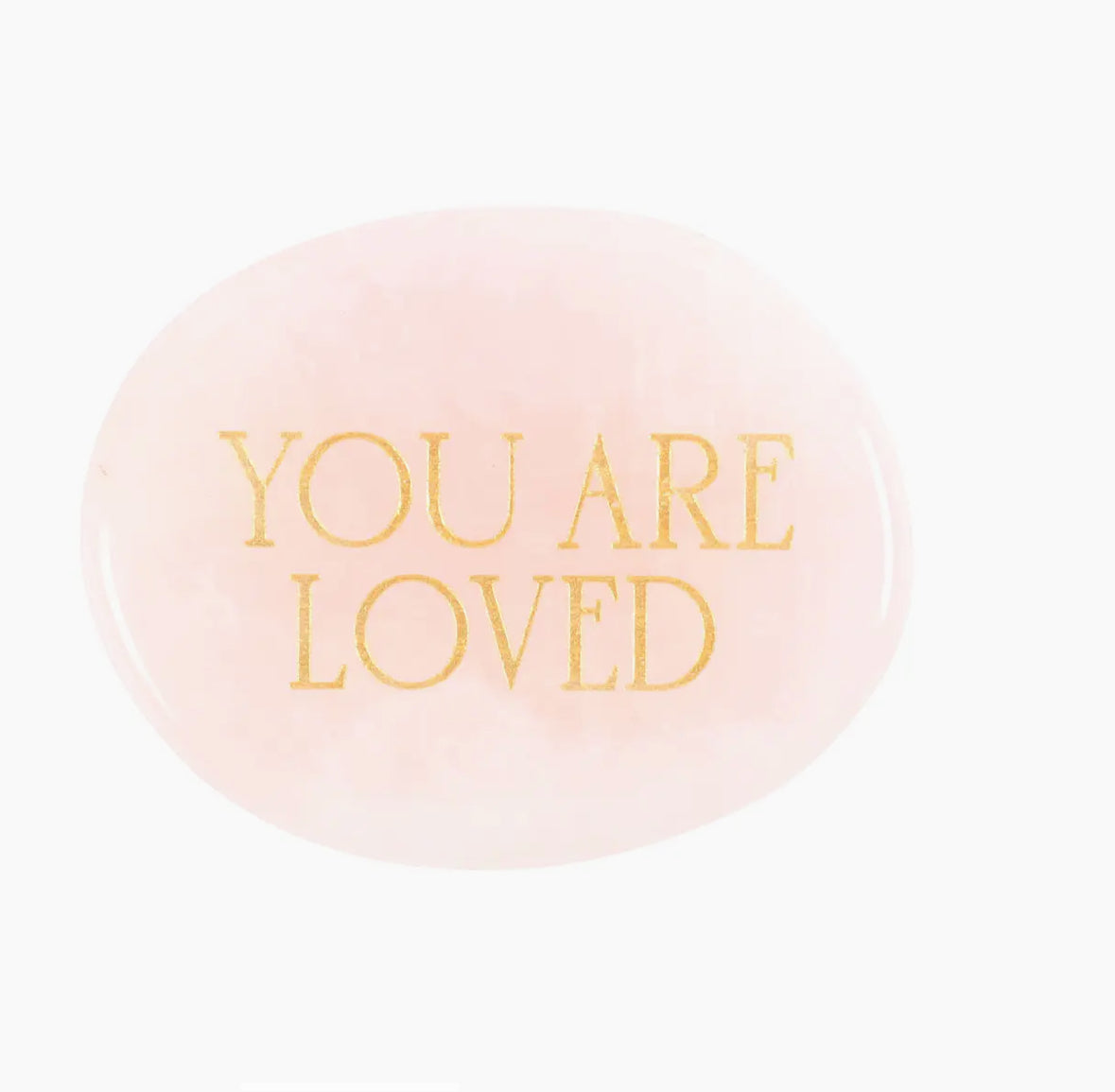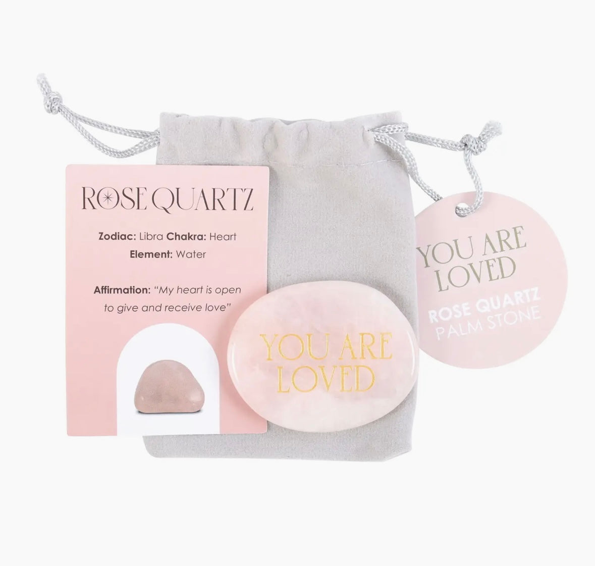 This healing rose quartz palm stone is accented by engraved gold-toned 'you are loved' text, making it a meaningful token...